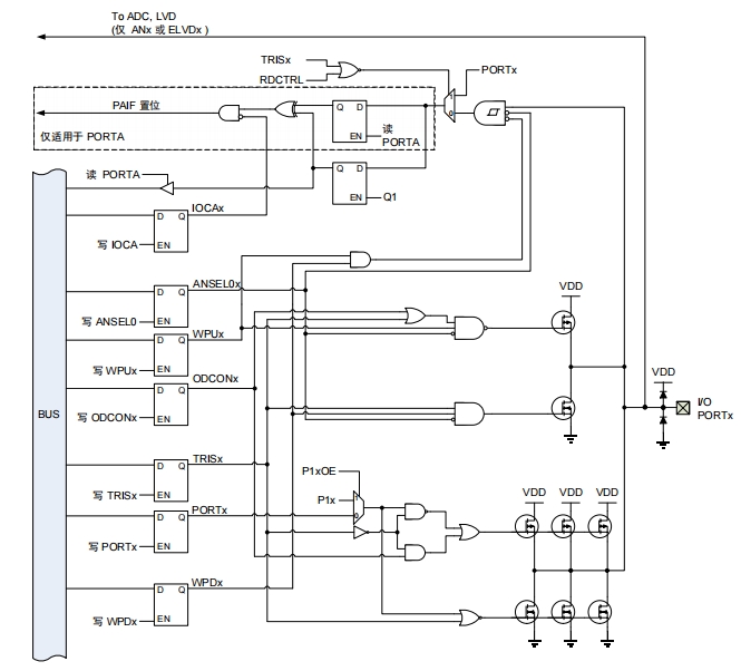 PORT端口是FT62FC6X系列微控制器的核心組成部分,提供了豐富的輸入輸出功能。以下是一個(gè)典型的PORT端口結(jié)構(gòu)框圖,展示了PORTA端口的內(nèi)部結(jié)構(gòu):