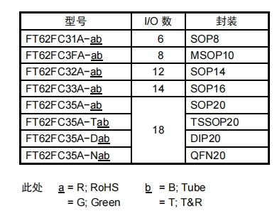 FT62FC6X系列的基礎(chǔ)型號(hào)為“FT62FC”,其中:
