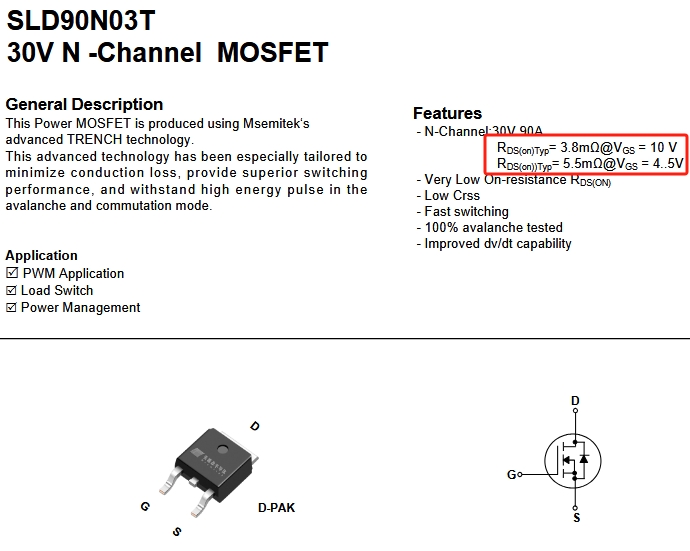 SLD90N03T:基于先進溝槽技術(Trench),優化了柵極電荷(Qg)和開關速度,適合高頻PWM應用。