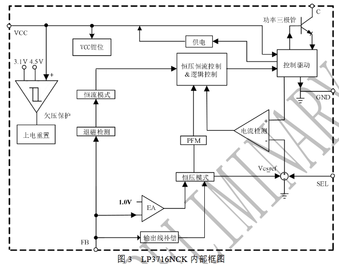 LP3716NCK芯片在設計和應用中展現出諸多顯著優勢。首先,其極簡化的外圍設計大幅減少了外圍元件數量,降低了系統成本和設計復雜度。其次,芯片的低待機功耗特性使其在節能方面表現出色,特別適合應用于對能效要求較高的設備中。LP3716NCK內部框架圖如下所示