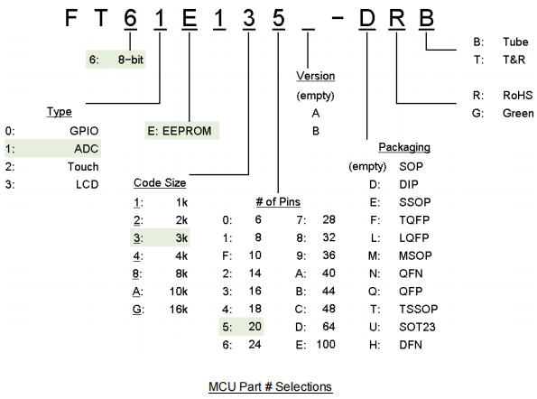 | FT61E135-RB/TRB/DRB/NRB | 3 K | 256 | 128 x8 | 18 | 8+1 | 4 | SOP20/TSSOP20/DIP20/QFN20 | 手持電動工具 |