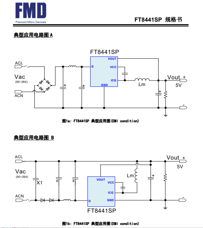 FT8441SP采用極高壓技術,通過內置高壓啟動電路、高壓功率MOSFET開關以及電流采樣電阻,減少了外圍元器件,大大的簡化了系統應用。內置的抖頻和軟驅動技術有效的提高了EMI性能。