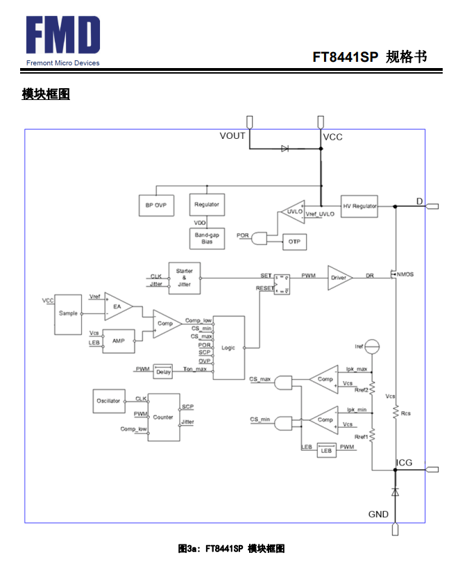 FT8441SP還集成了其他功能:VCC欠壓保護(UVLO)、VCC欠壓保護(UVLO)、VCC過壓保護(OVP)、過溫保護(OTP)、逐周期過流保護(OCP)、輸出短路保護(SCP),從而保證了系統的可靠性。