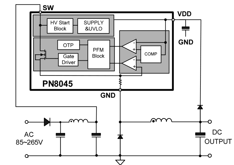 PN8045集成PFM控制器及650V高雪崩能力智能功率MOSFET,用于外圍元器件較簡的小功率非隔離開關電源。PN8045內置啟動模塊,實現系統啟動、待機功能。該芯片提供了智能化保護功能,包括過載保護,欠壓保護,過溫保護。另外PN8045的降頻調制技術有助于EMI特性。